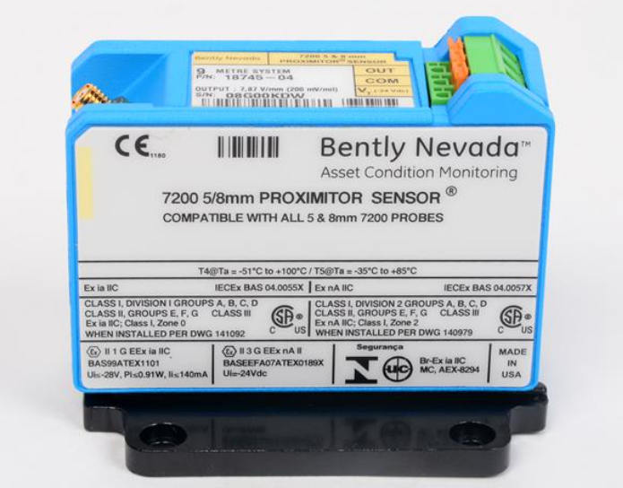 The system consists of a probe with an integrated coaxial cable, an extension cable and an approximator. All 7200 proximity sensor systems are compatible with 3300 and 9000 monitoring systems.