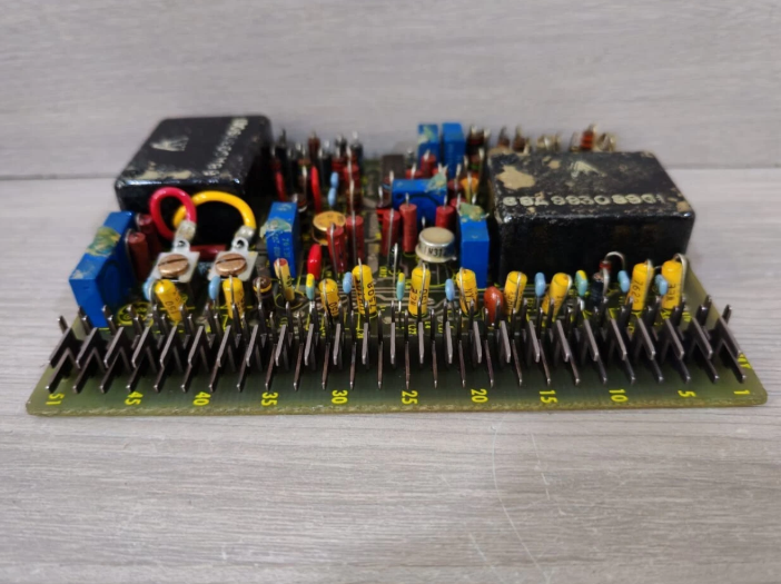 IC3600STKJ1热电偶放大器卡具有两 (2) 个大型黑色变压器。其中一个变压器放置在IC3600STKJ1的两端。它们标有部件号,即 88A98308831 和 993090G1。七 (7) 个电位器,也称为可变电阻器,位于IC3600STKJ1的不同位置。这些电位计是蓝色的,具有用于调节元件电阻的旋钮。许多电容器,其中一些是黄色常亮,另一些是蓝色常亮,在IC3600STKJ1右侧的一条线上交替。许多实心暗红色电阻器与至少三 (3) 个小圆形晶体管一起集中在IC3600STKJ1中心附近。超过四十 (40) 个金属插脚沿 IC3600STKJ1 PCB 的右边缘排列。这些可用于将印刷电路板连接到系统中的其他部件。这些插脚的编号从 1 到 51,通常以五 (5) 为增量递增。