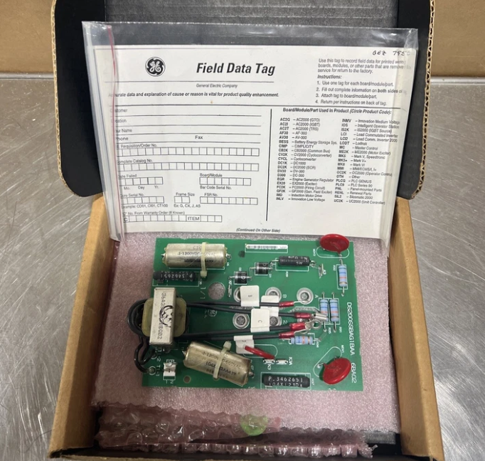 The GE DC300 driver buffer board DS200SSBAG1BAA has a 2-pin connector, 3 capacitors, and four terminals for connecting cables. The capacitors are identified as MOV1, MOV2 and MOV3. The logo is printed on the circuit board next to the capacitor. Since there are multiple cables connected to the board, these cables must be disconnected and then reconnected to the replacement board, there are guidelines to follow to avoid errors during the replacement process that could lead service personnel to connect the cable to the wrong terminal.