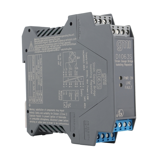 The D1063S is a single-channel DIN track load cell/strain gauge bridge isolation repeater manufactured by GE with the following features and functions: