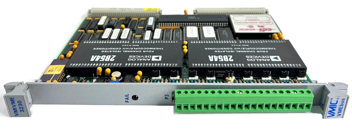 The VMIC/GE Fanuc VMIVME-3230 is an 8-channel low-level input board designed specifically for thermocouple input. The board performs baseline (cold junction) temperature compensation and provides linearization for various thermocouple types. All inputs are filtered and isolated with normal mode overvoltage protection. Optional configuration provides high level input. The thermocouple connection is performed on the screw terminal, which is directly connected to the P3 connector on the front panel.