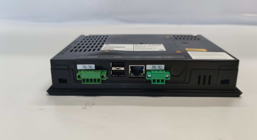 该 HMI 配有一 (1) 个以太网 I/P 通信端口和一 (1) 个 RS232 通信接口。它还具有三 (3) 个 USB 端口和一 (1) 个 SD SDHC 可移动卡插槽,用于内存扩展。