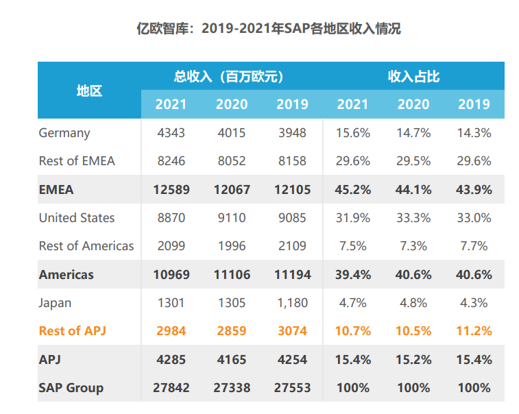 从全球最大的ERP服务商SAP的财报数据来看,SAP在亚太地区(不包括日本)的收入占比较小,2021年为10.7%,但近三年的收入规模相对稳定,说明亚太地区的 ERP市场仍有较大增长潜力。