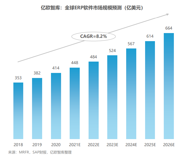 全球ERP软件市场规模呈平稳增长态势,预计2026年将超过660亿美元,ERP在全球范围内仍有较大的发展空间和前景。