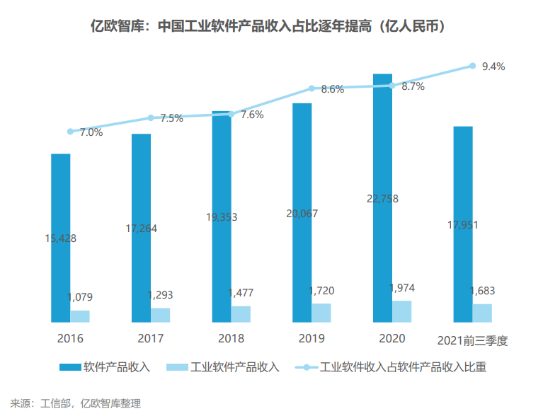 2021年前三季度,中国实现软件产品销售收入17951亿元,同比增长17%,其中,工业数字化转型加速及软件自主可控进程加快,推动工业软件产品实现收入1683亿 元,同比增长18.8%。
