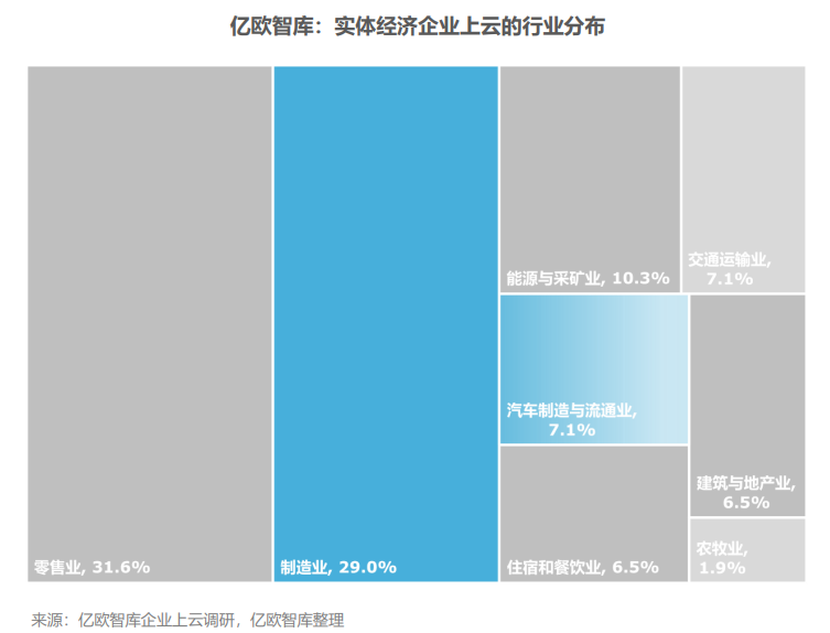 推动制造业信息化应用和数字化转型是中国建设制造强国的重要一环。1981年, 沈阳第一机床厂引入中国第一套企业应用的MRPⅡ软件,作为中国最先接受 ERP管理思想的行业,制造业不断深化信息化应用。同时,根据亿欧智库企业上云调研数据,中国制造业企业上云率仅次于零售业,达到29%,数字化转型进程不断加快。