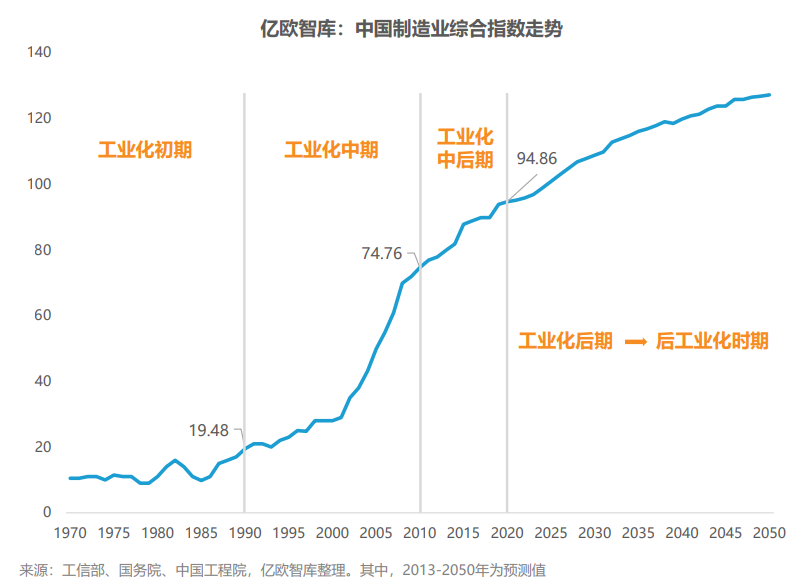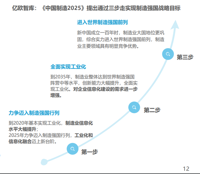 中国当前处于工业化后期,且已经于2020年基本实现工业化,但是中国的工业化进程还远未结束,制造业水平与海外工业强国相比仍有很大差距。2015年国务院印发 《中国制造2025》,提出通过“三步走”实现制造强国战略目标,为实现2025年迈入制造强国行列、2035年全面工业化以及新中国成立一百年时进入世界制造强国前列的目标,还需要继续提升国内制造企业的创新能力,加快信息化建设和数字化转型进程。