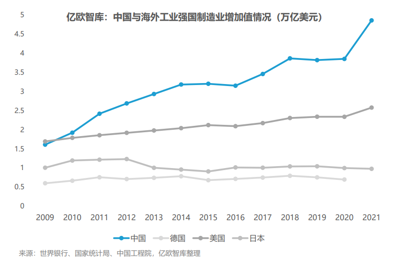 中国制造业地位不断提升,全球竞争日趋激烈。2010年,中国超越美国成为全球制造业增加值最高的国家,并在此后持续保持领先地位,而美国、日本、德国等工业强国制造业增长乏力,逐渐拉开与中国的差距。