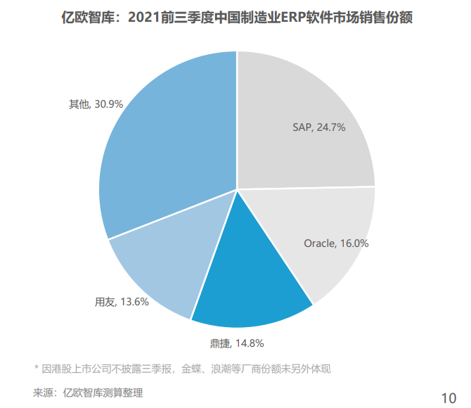 国内制造业ERP软件市场方面,SAP、Oracle仍然占据较大的市场份额,但本土ERP厂商正在缩小与国外头部厂商的差距,其中,鼎捷软件基于其在制造业领域的传统优势以及制造业ERP服务方案的积累,2021年前三季度完成制造业ERP软件销售收入超10亿元,在本土厂商中居于领先水平。