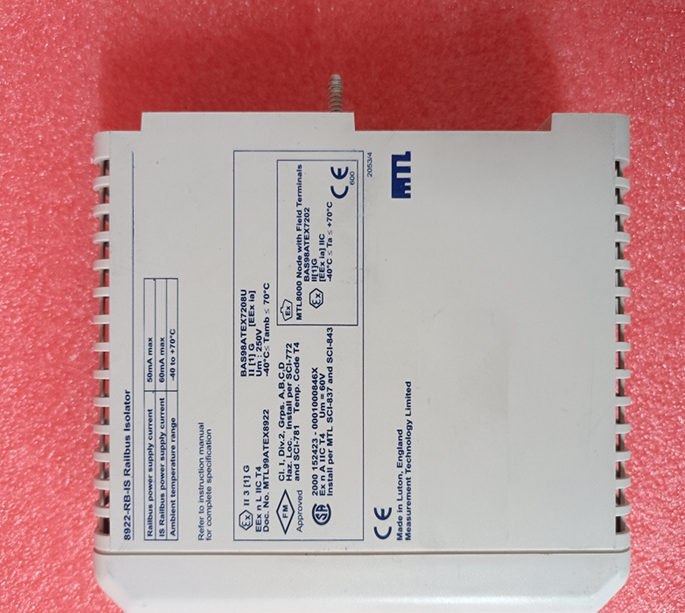 Manufacturer :MTL Instrument 8922-RB-S Raibus isolator provides current isolation between Rabus sections, prevents fault voltage intrusion, maintains field wiring module size (approx. :110(W x160(H x42 D) mm Weight 345 g (curved value) "Safety zone" trackbus power current *50 mA view maximum value,) @12V is Raibus source current *:60 mA(Max.) Power consumption in module at @12V: 1.2W (Max.) Shipping weight: 1.5kg