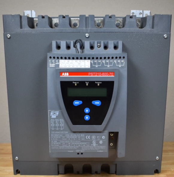 ABB intelligent soft starter PST210-600-70 is a novel motor control device that integrates soft start, soft stop and a variety of protection functions. It is called SoftStarter abroad. It is mainly composed of three opposite parallel thyristors and electronic control circuits connected in series between the power supply and the controlled motor. Different functions can be realized by using different methods to control the conduction Angle of the three opposite parallel thyristors so that the input voltage of the controlled motor can be changed according to different requirements. Soft starters and frequency converters are two completely different products. The frequency converter is used where speed regulation is required, and its output not only changes the voltage but also changes the frequency. The soft starter is actually a voltage regulator, used when the motor starts, the output only changes the voltage and does not change the frequency. The frequency converter has all the functions of the soft starter, but its price is much more expensive than the soft starter, and the structure is much more complex. The motor soft starter uses a soft starter connected in series between the power supply and the controlled motor to control the conduction Angle of its internal thyristor, so that the input voltage of the motor gradually rises from zero with a preset function relationship until the end of starting, giving the motor full voltage, that is, soft starting. In the process of soft starting, the starting torque of the motor gradually increases, and the speed also gradually increases.
