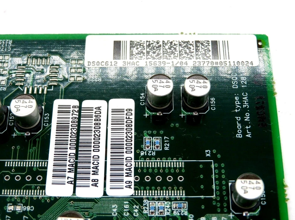Product ID:3HAC15639-1 ABB Model Name :DSQC 612 Catalog Description :DSQC 612 Ethernet Board Category Parts and Service Robot Controller IRC5 IRC5 Single Previous image Next image + Location of use (spare parts for the "Product") Order Origin: Malaysia (MY) Invoice Description :DSQC 612 Ethernet board Minimum order quantity :1 piece Sales unit: piece Order Multiple :1 piece only Quote: No Custom: No stock (warehouse): Menden Shanghai, Germany, China China Classification Customs Code :85176200 Part Type: New WEEE Category: Product not in the WEEE range Size Net Weight of product: 0.12kg Gross weight of product: 0.12kg Net depth/Length of product :180 mm Net Height of product :125.5 mm Net Width of product :21.5 mm Additional information Frame size: Spare Parts _ Parts Product Name: DSQC 612 Ethernet module ABB Model name :DSQC 612