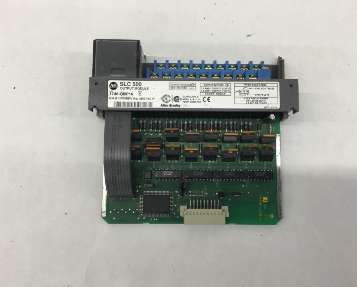 Allen-Bradley 1746-OBP16 is a digital output module belonging to the SLC 500 series of output controllers. It has 16 output points and is suitable for high-current environments. The 1746-OBP16 operates at a voltage between 20.4 and 26.4V DC. It consumes 250mA backplane current at 5V and 0A backplane current at 24V. It has a blown fuse indicator light, and when the fuse is blown, the "processor error" and "blown fuse" LED indicators light up. The 1746-OBP16 has a rated heat dissipation of 0.31W per point, a minimum dissipation of 1.25W, and a total dissipation of 6.26W.