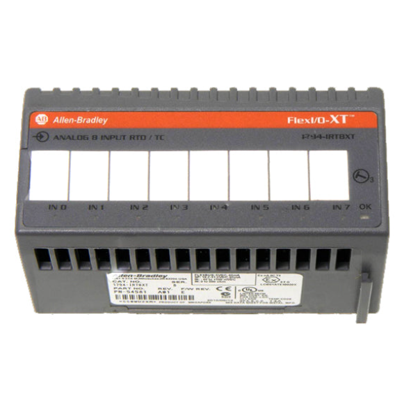1794-IRT8XT 模块由 Allen-Bradley 在其 FLEX I/O 系列中设计和制造,用作热电偶、RTD 和毫伏输入模块。1794-IRT8XT 模块是 Allen-Bradley FLEX I/O 模块系列中的较新型号。它不应用于具有腐蚀性气氛和大量液体的工业环境,因为它没有保护性保形涂层。该模块有 8 个模拟输入。它可以接受毫伏源输入、热电偶输入以及 2 线、3 线和 4 线 RTD 输入。