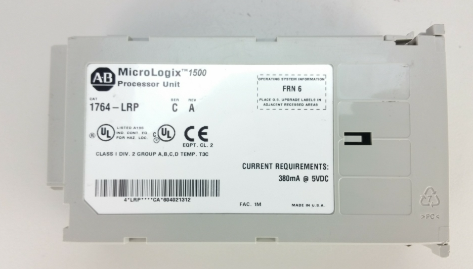 Allen-Bradley 1764-LRP 是 MicroLogix 1500 处理器。它是 MicroLogix 1500 可编程控制器的一个组件,可为各种应用提供大容量存储器解决方案。它为数据和程序提供 14K 字的用户可配置存储器。对于 1K 字的程序(包括位、计数器、定时器和数学指令),它的程序执行时间约为 1 毫秒。在控制器系统中,1764-LRP 处理器单元提供微调电位器、运行/远程/编程模式开关、通信切换按钮和逻辑处理。它用作实时时钟、DAT 和内存模块的接口。该处理器使用控制器组合件来支持附加 I/O bank 中最多 8 个 I/O 模块。