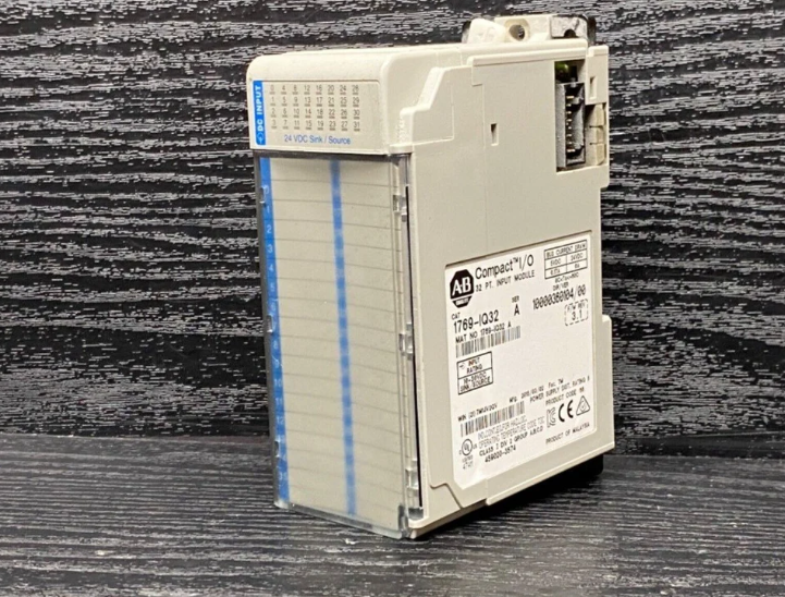 The Allen-Bradley discrete input module, catalog number 1769-IQ32, is part of a family of compact I/O modules that are compatible with MicroLogix 1500 and CompactLogix controllers. The module has a particularly high density of input channels, as it has thirty-two (32) 24VDC input channels that support both feed and pull current wiring configurations.