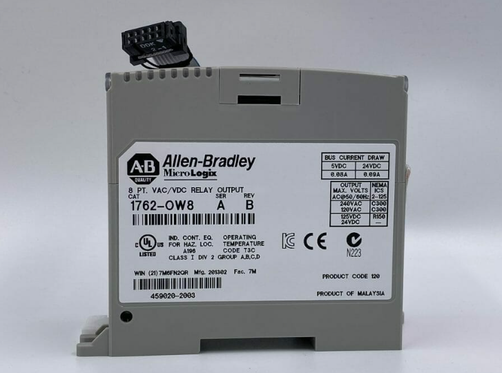 Allen-Bradley 1762-OW8 is an eight (8) point AC /DC relay type output module for the MicroLogix 1100/1200/1400 programmable logic controller. It is part of the Bulletin 1762 MicroLogix extended I/O module family. By maximizing the controller's I/O capabilities in terms of type and quantity, it provides flexibility in industrial environments. It supports rackless modular design, reduces replacement parts inventory, and improves cost savings. In addition, the 1762-OW8 can be mounted on a panel or DIN rail.