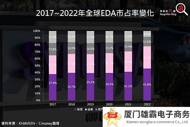 市场地位方面,新思科技的 EDA 市占率从 2021 年 41.2% 跃升至 2022 年 45.8%,除了产品及技术持续进化之外,DSO.ai ( 将 AI 导入设计流程、寻求潜在最佳解决方案 ) 更获得意法半导体 (STM) 及 SK 海力士的采用,进一步巩固其龙头宝座。另外,新思科技的 IP 市占率全球排名第二 ( 2022 年市占率约 20% ),仅次于 Arm ( 2022 年市占率约 41% ),但在接口 IP、内存 IP、模拟 IP 及实体 IP 则排名第一。