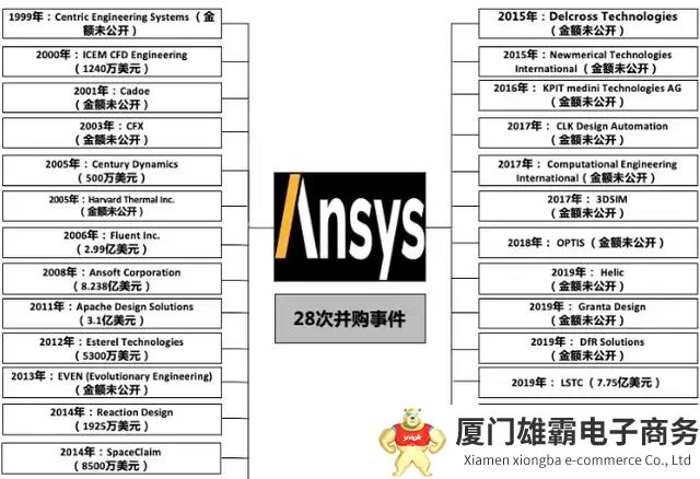 在Ansys公司的历史上,也有着多大28次的并购事件(如下图)。其中2006年收购了在流体仿真领域处于领导地位的美国Fluent公司,以及2008年收购了在电路和电磁仿真领域处于领导地位的美国Ansoft公司。通过这几次关键整合,Ansys公司成为全球最大的仿真软件公司。