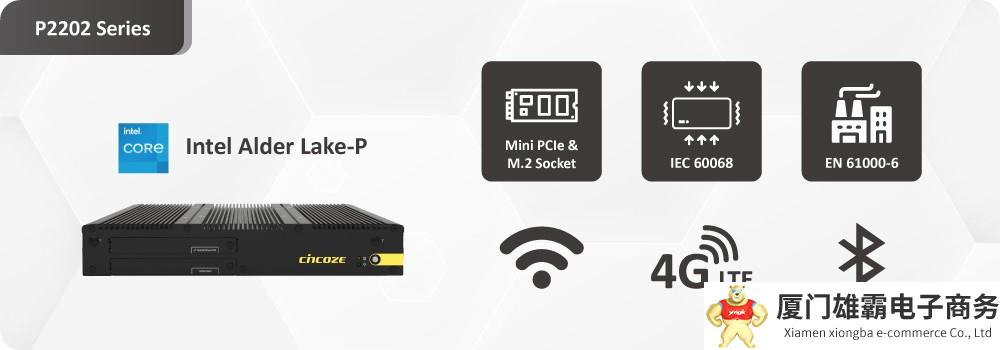 P2202系列共有P2202以及搭载PCIe扩充的P2202E两款型号,搭载i3/i5 Intel Alder Lake-P (U-Series) CPU,记忆体支援至高DDR5 64GB 4800MHz。其轻薄的机身设计(254.5 x 190 x 41.5 mm,Model: P2202),以及丰富的原生I/O,透过内建的Mini PCIe、M.2 Key E插槽,还能支援无线通讯模组如4G、WIFI、蓝牙等。特别是P2202E还拥有PCIex4插槽,可支援75W的扩充卡,透过德承专属的模组化扩充功能增加PoE或IGN功能,满足不同的应用需求。P2202系列秉持Cincoze一贯的高品质要求,除了具备宽温( -40°C - 70°C ) 宽压 ( 9 - 48VDC )的适应性,也成功通过多种震动与冲击的可靠性测试,包括正弦振动 (1G)、随机震动 (5G) 与耐冲击 (50G) 等。同时,更通过严格的工业环境电磁兼容性(EMC) 测试标准 (EN61000-6-2 及 EN61000-6-4),种种测试标准体现了P2202系列的高规格防护和可靠度。