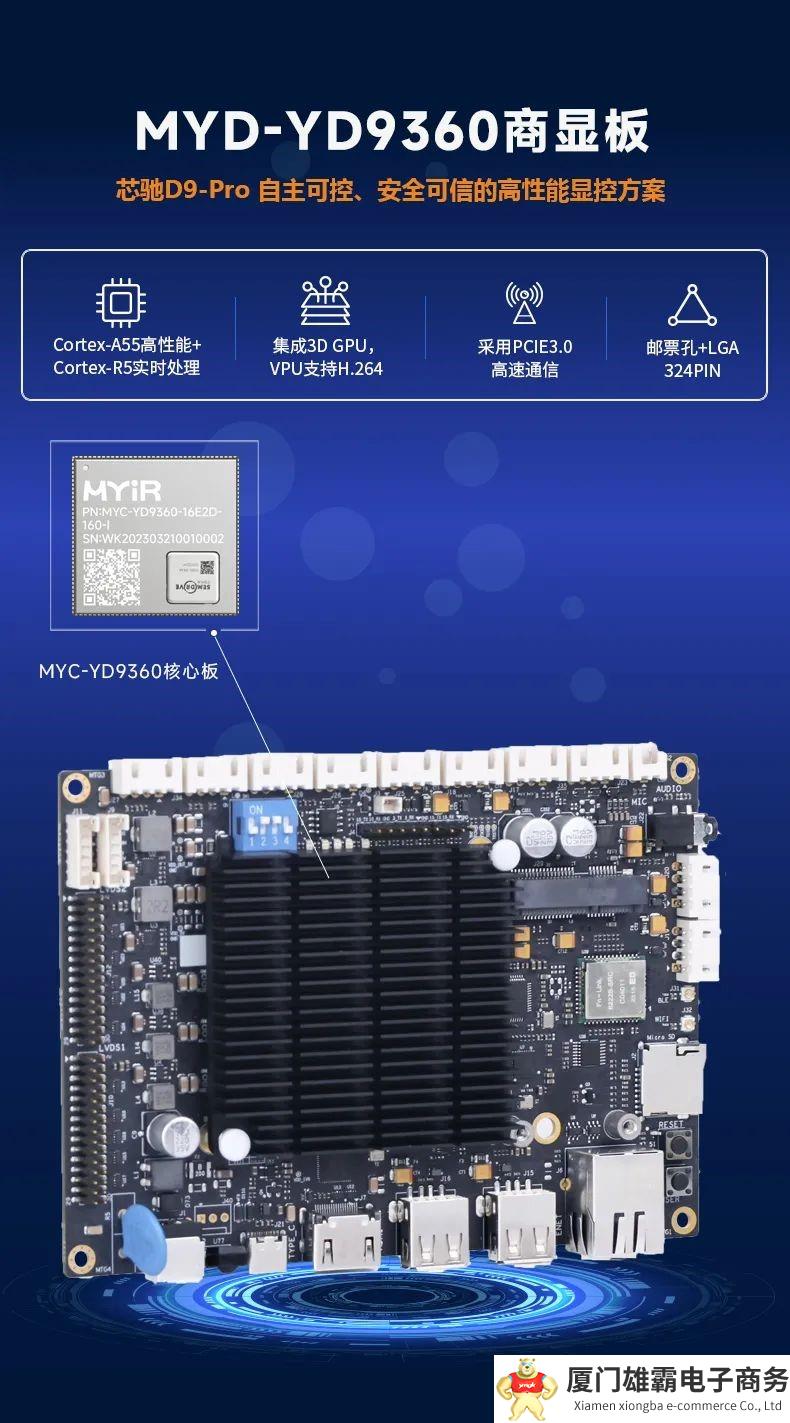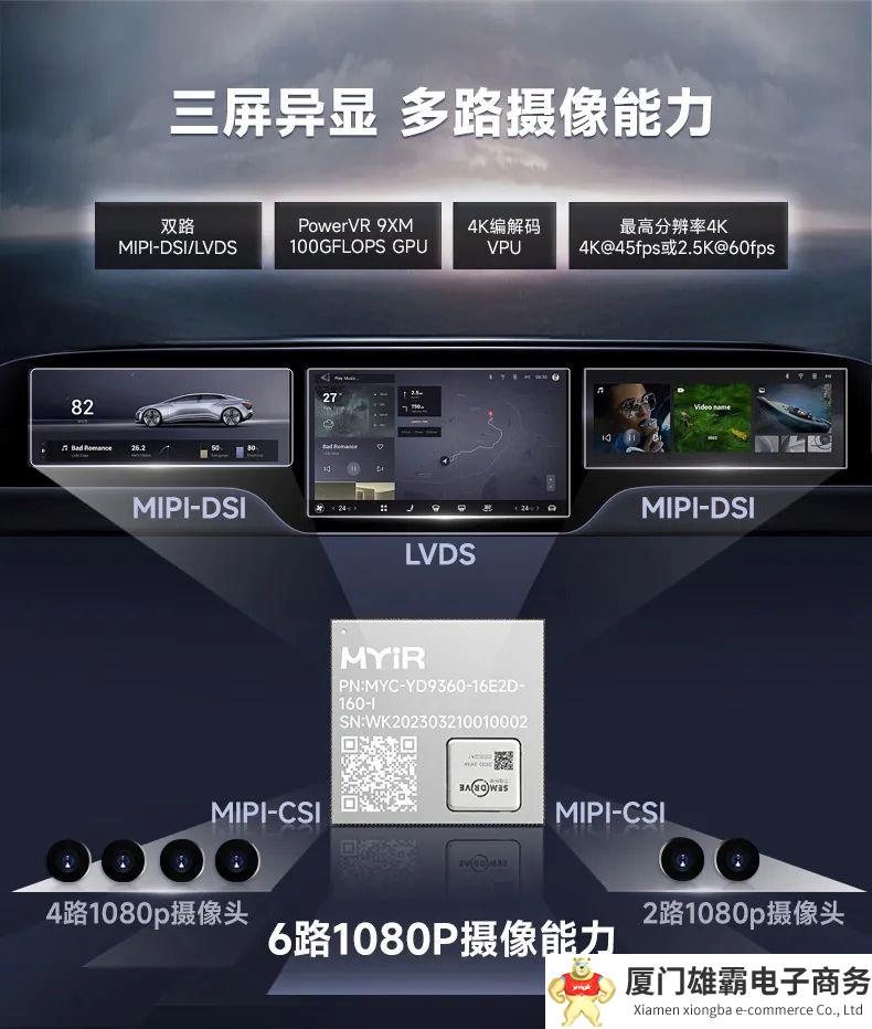D9360处理器是芯驰推出的一款六核CPU的高度集成、低功耗化、高安全性芯片,采用AEC-Q100车规级芯片工艺,并且通过ISO26262 ASIL_B功能安全认证,是国产高性能芯片的代表作。米尔电子与芯驰科技(SemiDrive)强强联合,基于芯驰D9-Pro高性能国产工业处理器共同推出米尔MYC-YD9360核心板、开发板及商显板,赋能新一代车载智能、电力智能、工业控制、新能源、机器智能等行业发展,满足多屏的显示需求。