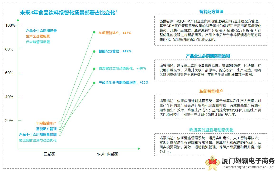 在食品饮料行业,面临着诸多挑战:多样化的产品种类、高要求的产品安全性以及快速迭代的产品周期。为应对这些挑战,企业在工艺设计、计划调度、仓储配送和供应链物流交付等方面进行投入,以满足不断变化的消费者需求。由于消费者需求转向速度快,传统产品开发难以迅速响应,数字化手段成为重要工具,特别是通过全流程管理提高研发效率和产品质量。报告调研数据显示,智能配方管理、车间智能排产和物流实时监测与动态优化三类场景未来3年内部署占比均超过50%,场景部署增量平均在40%及以上。