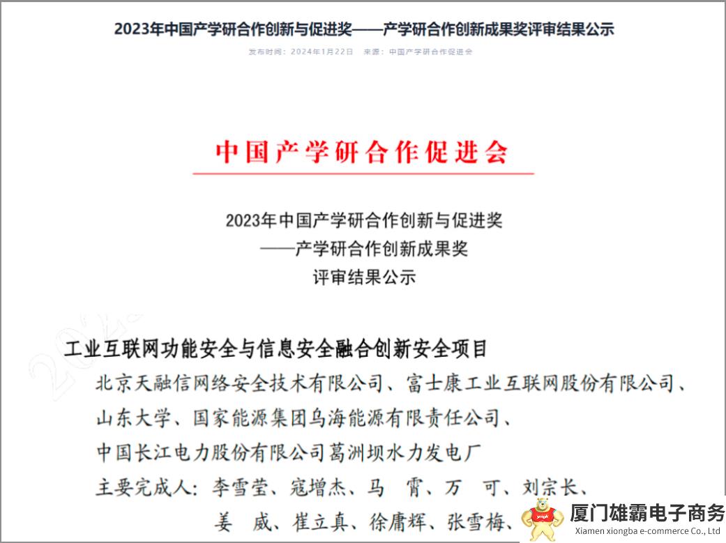 1月22日,工业富联联合北京天融信网络安全技术有限公司、山东大学等共同完成的“工业互联网功能安全与信息安全融合创新安全项目”获得中国产学研合作创新成果优秀奖,该奖项为中国产学研界最高荣誉奖。