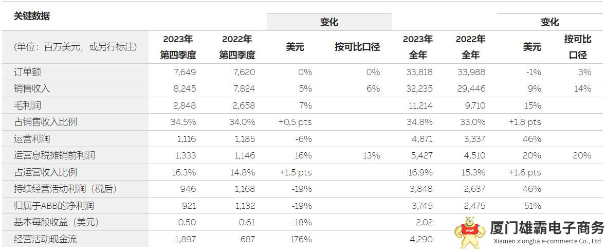 2024年第一季度,ABB预计销售收入按可比口径将实现低至中等个位数增长,运营息税摊销前利润率将保持稳定或同比略有增长。
