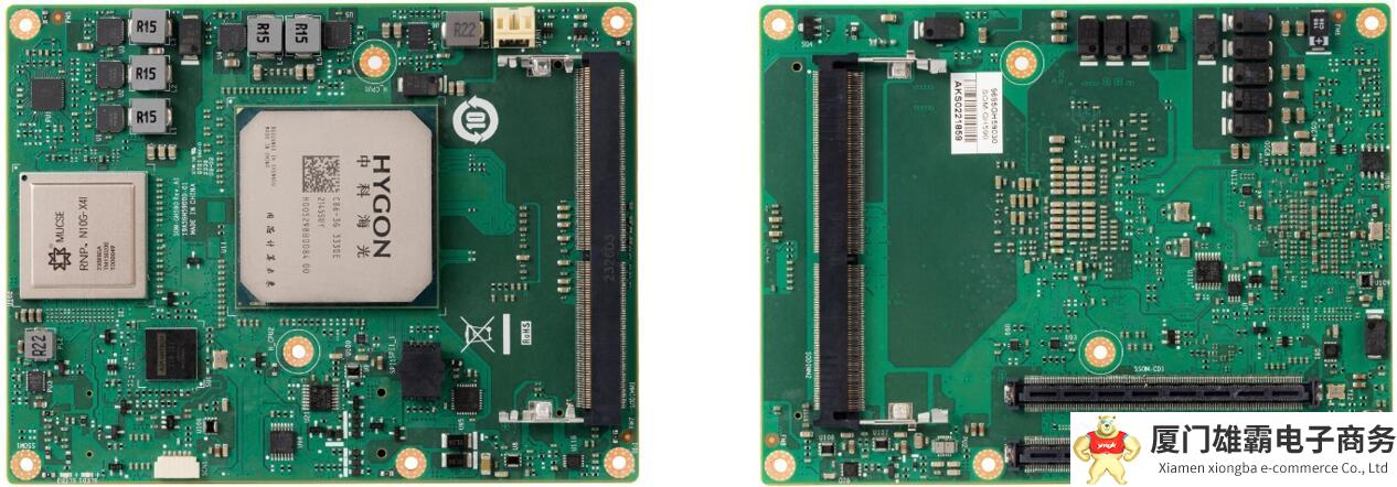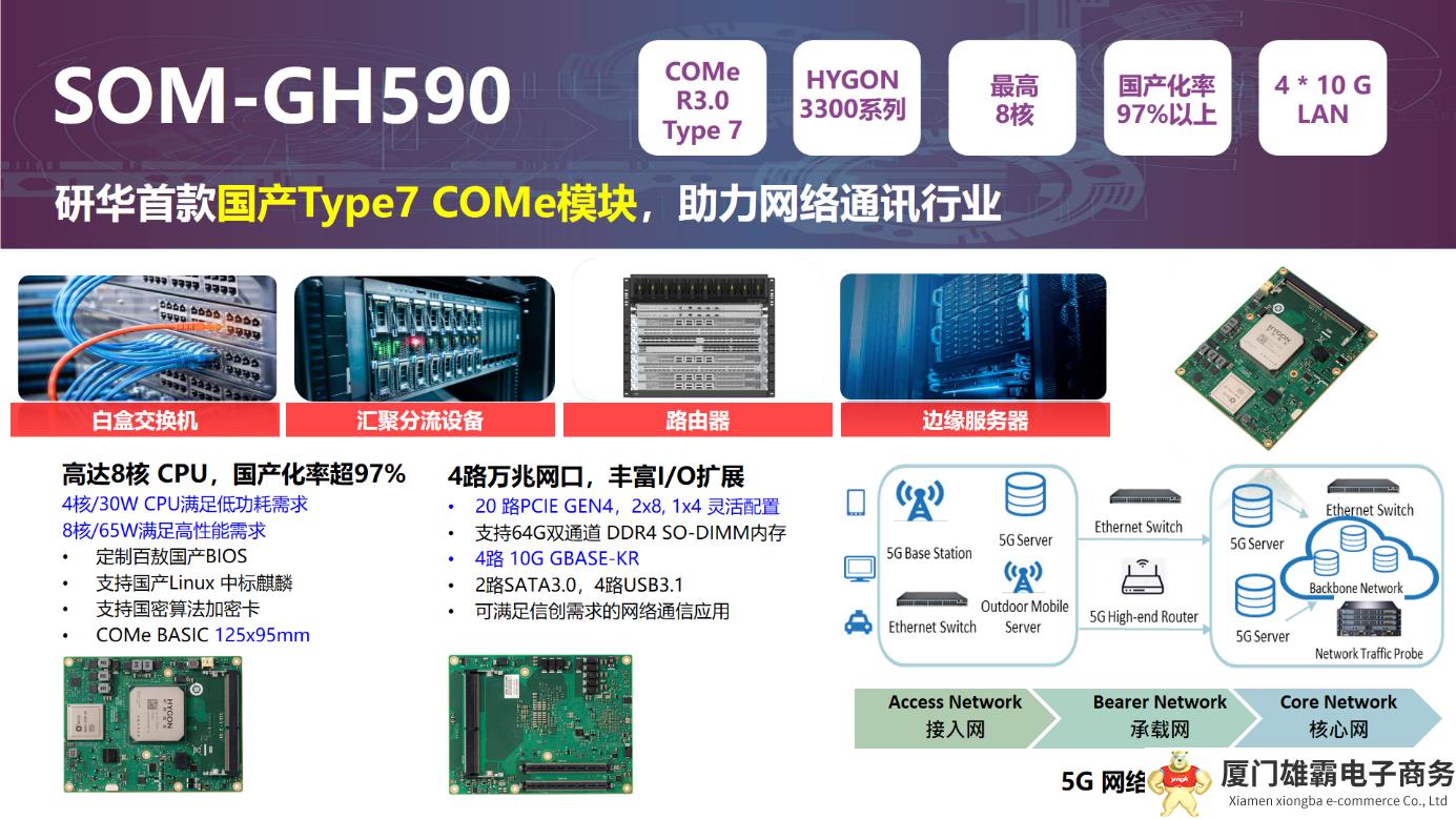本次推出的全新国产Type7核心模块SOM-GH590 主要是面向网络通讯行业从数据中心到边缘端等一系列应用的国产化产品需求。搭载海光3330(E)/4核以及3350(E)/8核处理器,TDP支持30W-80W,支持高达64GB的内存容量。带有4路10G BASE-KR、20路PCIE4.0、2路SATA3.0以及4路USB3.0等丰富的扩展接口,可以满足网络通信应用中海量数据传输对高速接口的需求。