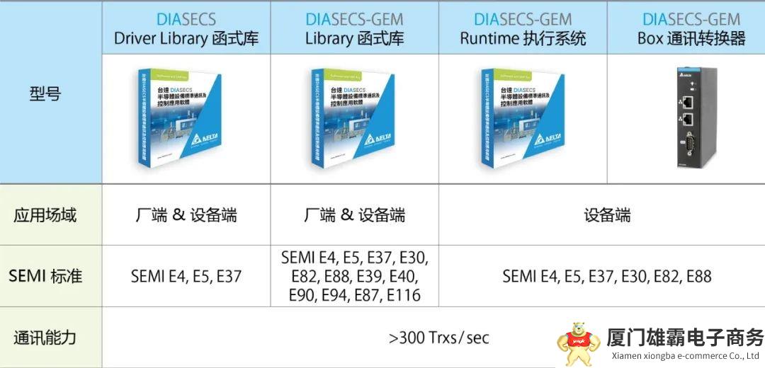因应不同的使用场景及应用深度,台达的DIASECS 系列有四种产品可以选择:DIASECS Driver Library、DIASECS-GEM Library、DIASECS-GEM Runtime、DIASECS-GEM Box。