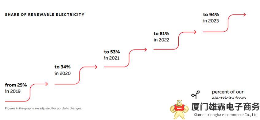 与2019年相比,ABB能耗降低了21%。到2023年底,ABB有64%的能源消耗和94%的电力来自于可再生能源。