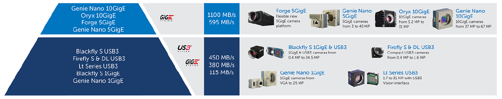 随着视觉系统的发展或新相机的推出,Spinnaker 还将继续支持各种成像解决方案,这一点请放心。受支持相机上的接口包括 USB3、1GigE、5GigE 和 10GigE。其中包括 Blackfly S、Firefly S、Genie Nano、Lt Series、Forge 和 Oryx 等型号,未来还会支持更多型号。