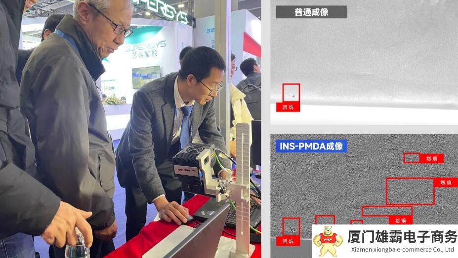 集成了苏映视自研2.5D光源与高速相机,利用相位偏折技术,捕获高反光物体表面缺陷。现场演示的软包电池表面缺陷检测案例凸显了其消除表面光晕干扰,高效呈现缺陷能力。
