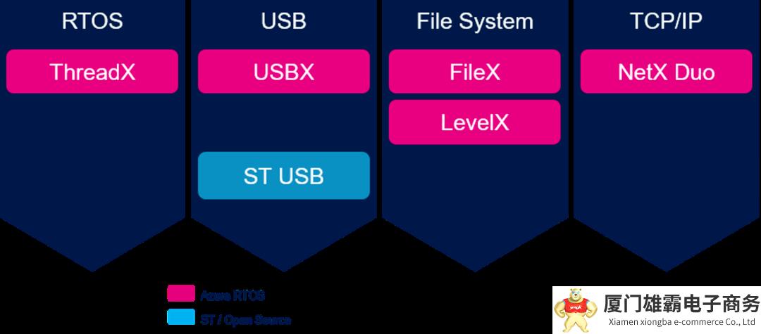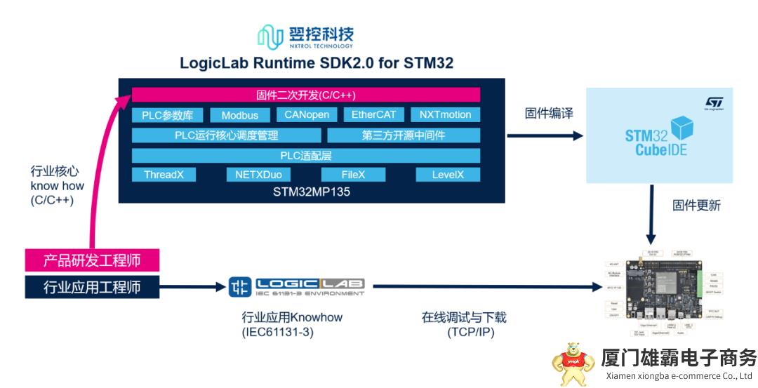 翌控科技基于STM32系列处理器提供全新LogicLab Runtime SDK 2.0版本,基于标准开发板集成Eclipse ThreadX组件、板级驱动、PLC核心库移植、现场总线通讯库、运动控制库实现等等功能,实现开箱即用,大幅削减基础平台研发投入。LogicLab Runtime SDK可直接通过STM32CubeIDE导入工程,并进行编译并生成固件,同时可基于C/C++对PLC核心功能进行扩展,完全固化行业核心Knowhow,从而实现独特的PLC控制器产品,核心架构图如下: