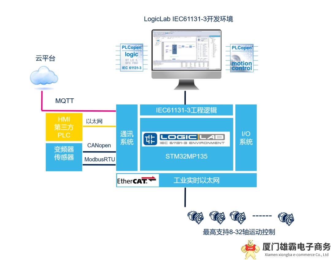 翌控科技和STM32联合开发,完成LogicLab解决方案对STM32MP135处理器的适配,包括符合IEC61131-3标准的PLC运行系统、Modbus协议栈、CANopen主站协议栈、EtherCAT主站协议栈、运动控制等等组件。