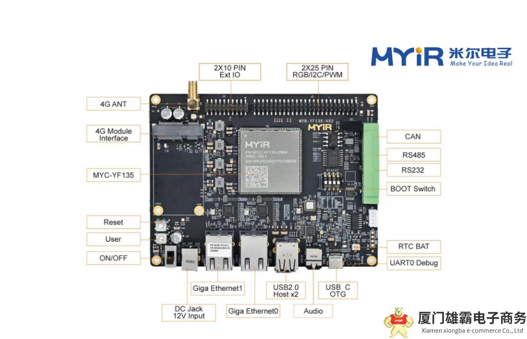 开放式高实时高性能PLC控制器产品的硬件生态,可以加速客户开发产品进度以及降低研发难度和风险。通过与米尔电子深入合作,LogicLab Runtime SDK已适配米尔电子的MYD-YF135-4E512D-100-I开发板,该开发板采用核心板+底板分离式设计,工业级设计可快速进行产品化,具备2路千兆以太网接口同时适配以太网通讯(支持ModbusTCP通讯)与EtherCAT主站,1路RS485与1路RS232适配ModbusRTU接口,1路CAN总线适配CANopen主站,外扩RGB显示屏可进行图形化界面开发以及引出多路通用GPIO实现本地高速IO子系统,开发板图片如下: