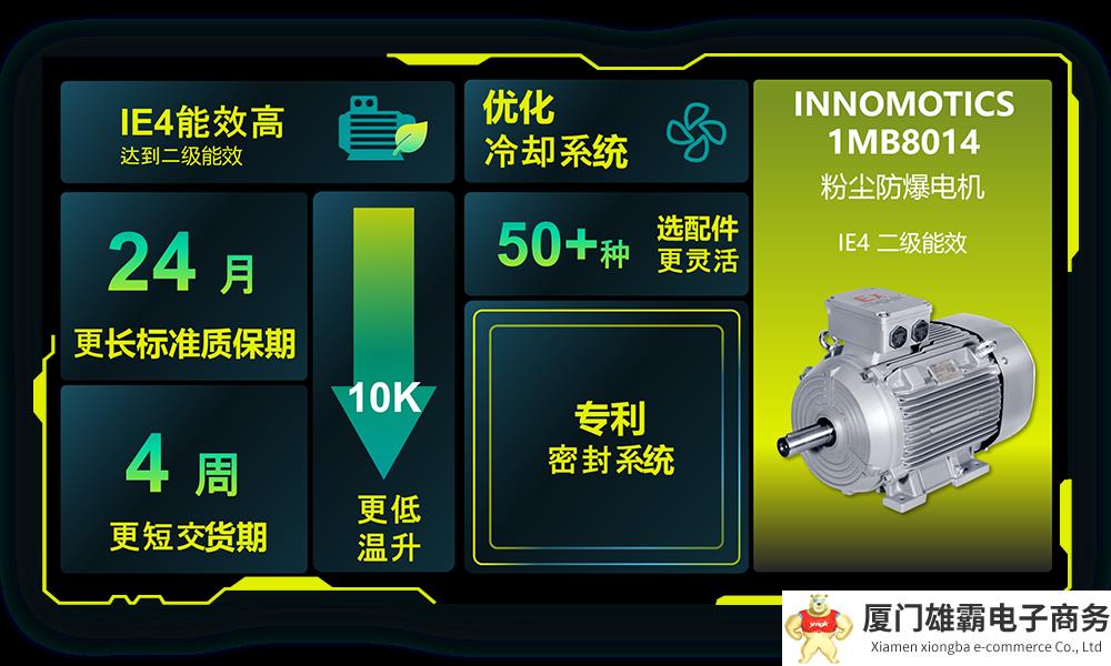 本次茵梦达发布的INNOMOTICS 1MB8014全新IE4国标二级能效粉尘防爆电机是自2023年9月茵梦达发布高端品牌INNOMOTICS 1LE8005 IE5国标一级能效电机之后,标志着公司在高效节能及特殊环境适应性电机产品研发上的又一里程碑。