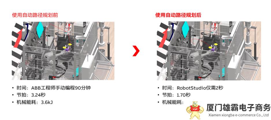 此外,ABB还开发了智能软件来优化机器人的效率。例如RobotStudio中的自动路径规划功能。只需输入机器人要到达的最终位置,其自动路径规划功能便能在几秒钟内计算出从起点到终点的最佳无碰撞路径。