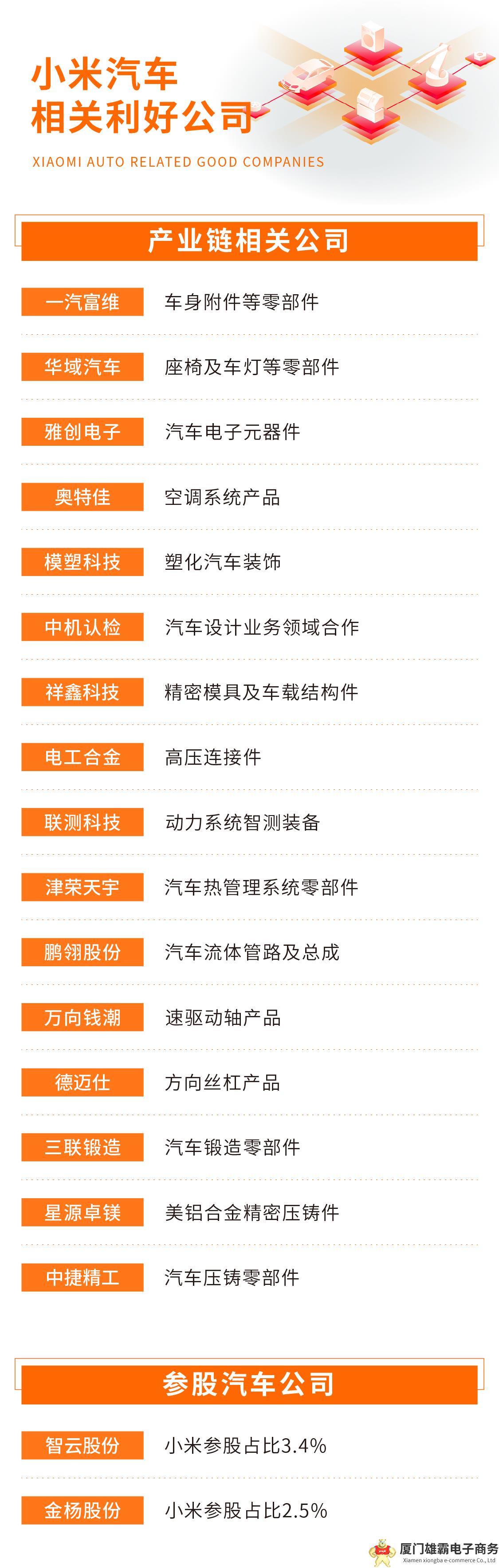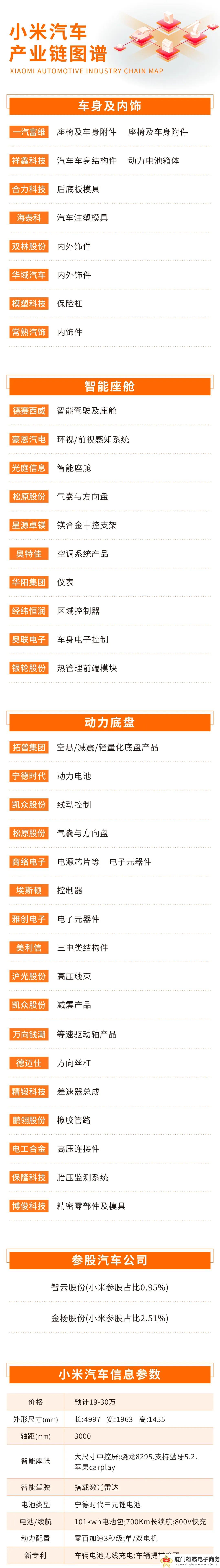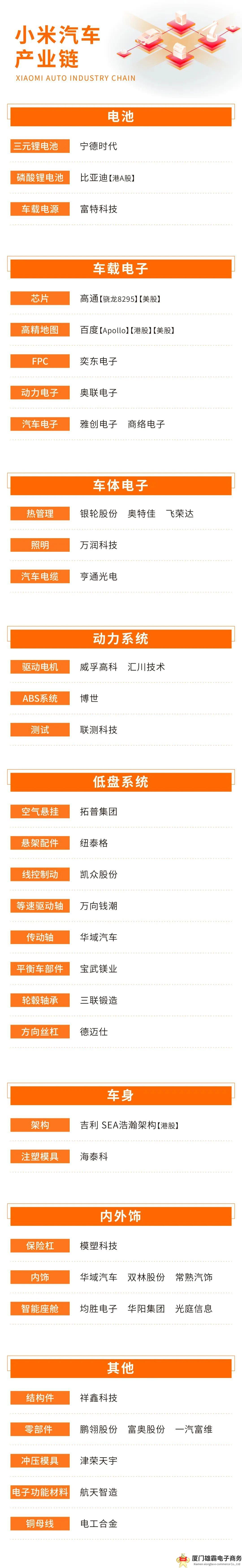 支撑起小米汽车成功打造,离不开其强大的供应链体系。根据公开信息显示,小米汽车的核心零部件供应商阵容堪称豪华,汇聚了国内外众多知名企业,他们共同为小米汽车的高品质和卓越性能提供了有力保障。本次,我们就小米产业链及涉及的供应商进行了总结。
