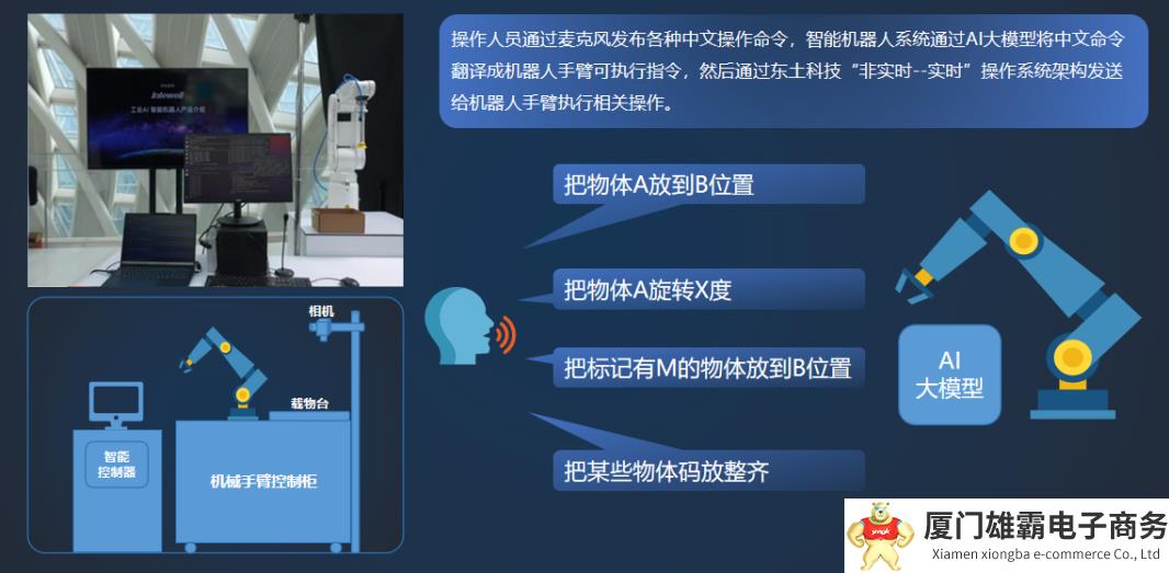 工业AI智能机器人控制系统基于东土科技NewPre 3102智能控制器打造,此款控制器是国内首个实现工业AI的智能控制器,内嵌了东土科技旗下子公司科东软件的鸿道(Intewell)工业操作系统和MaVIEW工业软件,搭载了英特尔芯片,通过AI大模型将人类自然语言指令转换成机器人的运动命令,由人类语言来控制机器人工作。这套控制系统基于Intewell工业操作系统,提供1ms控制周期,满足机器人实时运动控制任务。Intewell鸿道操作系统集成AI大模型推理引擎,基于东土自研的语义算法,AI机器人大语言模型接收任务,将其解析为机器人可执行的运动函数及参数,这些参数由视觉语言模型进一步分析,根据分析的结果在算法中定位坐标,之后坐标作为机器人运动参数,让机器人完成相应动作指令。整套系统无需经过繁琐的示教开发过程,系统的易用性得到有效保障。东土智能机器人控制系统相较于某外资头部工业企业在今年2月份推出的自然语言指令执行站,具备更为高级的语义理解能力,可以执行更加复杂的任务。