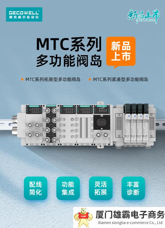作为本次发布的唯一一个阀岛产品,德克威尔产品经理萧子鹏介绍MTC系列经历了两次升级迭代,目前已经发展到第三代产品,是一款将远程I/O模块与电磁阀相结合的高性能阀岛,实现了电路模块和气路模块的一体化,可同时支持多种工业通讯协议(Profinet、EtherCAT、Ethernet/IP、CC-Link IEFB),能兼容市面上主流的PLC,可满足客户对不同品牌PLC的通讯需求,无需额外的协议转换模块,具有集成化、模块化、高防护、丰富诊断的特点,相较于常规电磁阀组,可以节省90%的组装接线时间。特别值得一提的是,MTC系列阀岛的主体材质为复合材料,具有较轻的重量,非常适用于对产品重量有要求的机械手末端等工作场景。此外,在锂电行业,阀岛被用于叠片机;在光伏行业,则用于扩散设备、ALD设备以及3C行业的自动化组装线等领域。