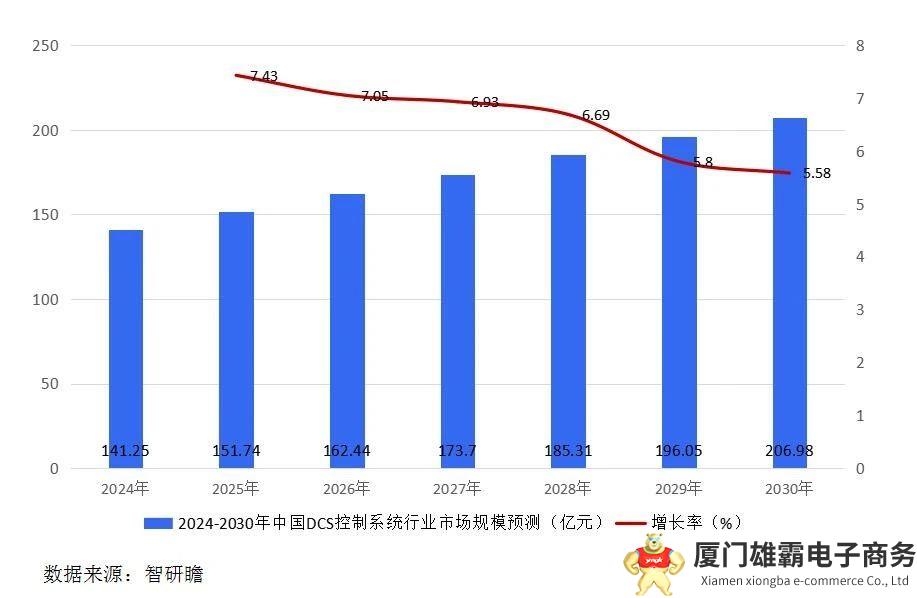 据智研瞻预测,2024-2030年中国DCS控制系统行业市场规模增长率在5%-8%,2030年中国DCS控制系统行业市场规模206.98亿元,同比增长5.58%。2024-2030年中国DCS控制系统行业市场规模预测如下: