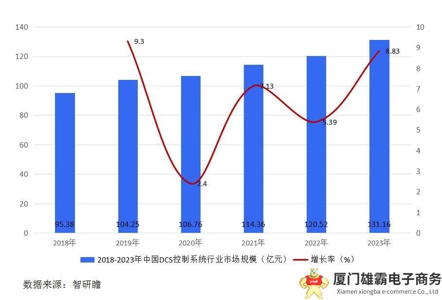 据智研瞻统计显示,2018年中国DCS控制系统行业市场规模95.38亿元,2023年中国DCS控制系统行业市场规模131.16亿元,同比增长8.83%。2018-2023年中国DCS控制系统行业市场规模如下: