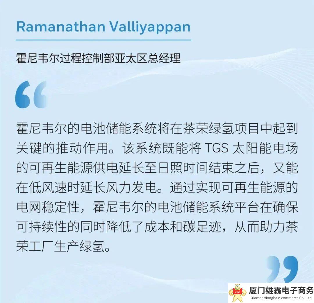 霍尼韦尔将负责为该项目提供一揽子成熟技术,例如项目自动化设计和管理,能源转型所需的能源管理系统,包括电池储能系统 (BESS),帮助TGS将可再生能源整合到绿氢工厂中。