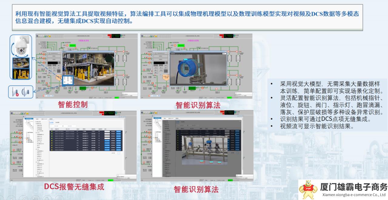 和利时在机器视觉的实时控制主要体现在采用智能视觉算法提取现场生产工艺画面有效特征,通过控制逻辑执行,形成具有视觉处理能力的控制闭环。智能视觉控制优化应用可替代现有流程行业人工肉眼观察操作的应用场景,可有效降低运营操作人员的劳动强度。现已经在化工、电力、冶金等行业应用推广。