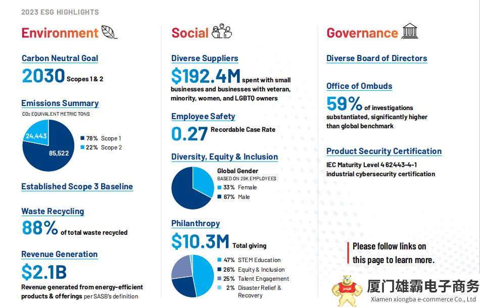 早在 2020 年,罗克韦尔就公布了碳中和目标——公司计划于 2030 年实现范围一(直接)和范围二(间接)的碳排放净零目标。罗克韦尔《可持续发展 2023 年度报告》详细介绍了公司为实现这一目标所做的努力,并列出了范围三(价值链)的排放基线信息,阐明了公司价值链的间接排放占其范围三碳足迹的 99%。