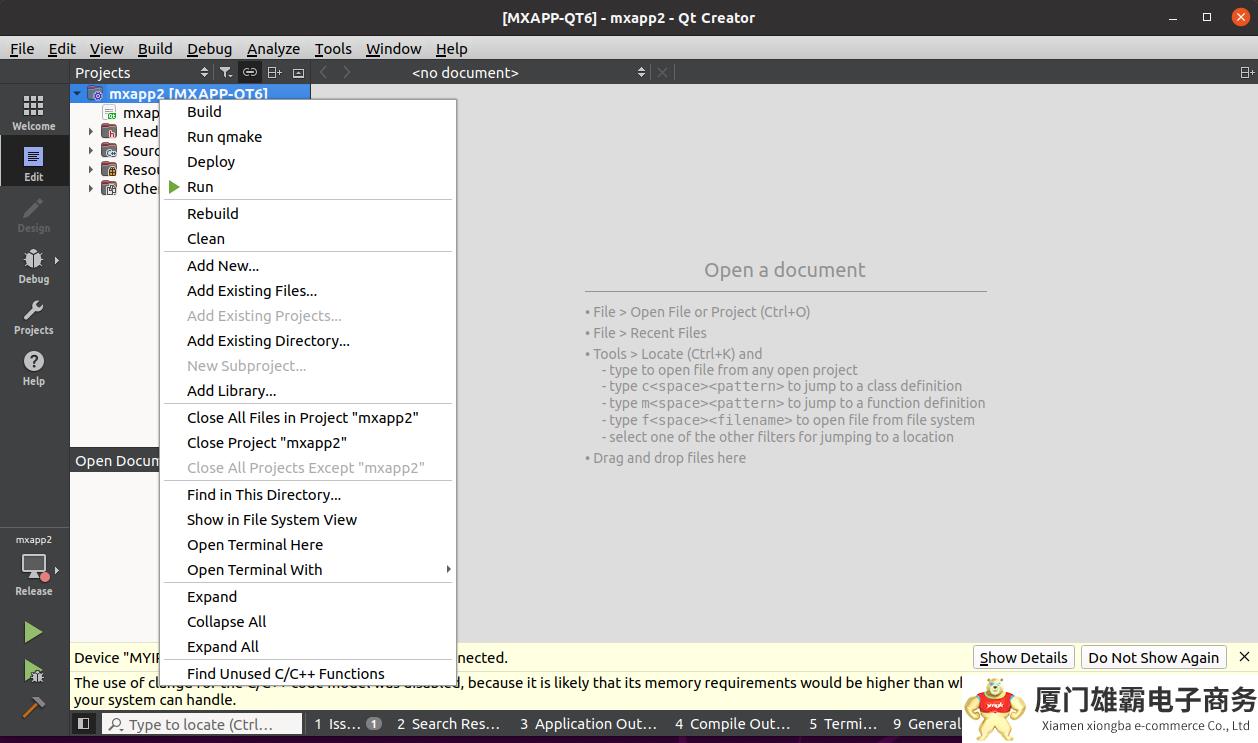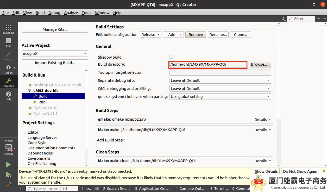9)将 MXAPP-Qt6.tar.gz 拷贝到 Ubuntu 下的一个工作目录中并解压出源代码。配置为相应的编译工具套件,就可以编译此例程。在菜单栏选择"File"->"Open File or Project",在打开的对话框中,浏览到"mxcpp"例程的目录下,选择"mxcpp.pro"文件,点击"Open"按钮。项目打开后,在左侧菜单列中,选择"Projects"图标,右侧界面切换为 manage kits 管理界面,在"Build & Run"标签下,选择"LM93"选项的 kit,这样项目就会使用"LM93 "的相关配置 kit 构建应用。然后右键选择"mxapp2"点击Build。
