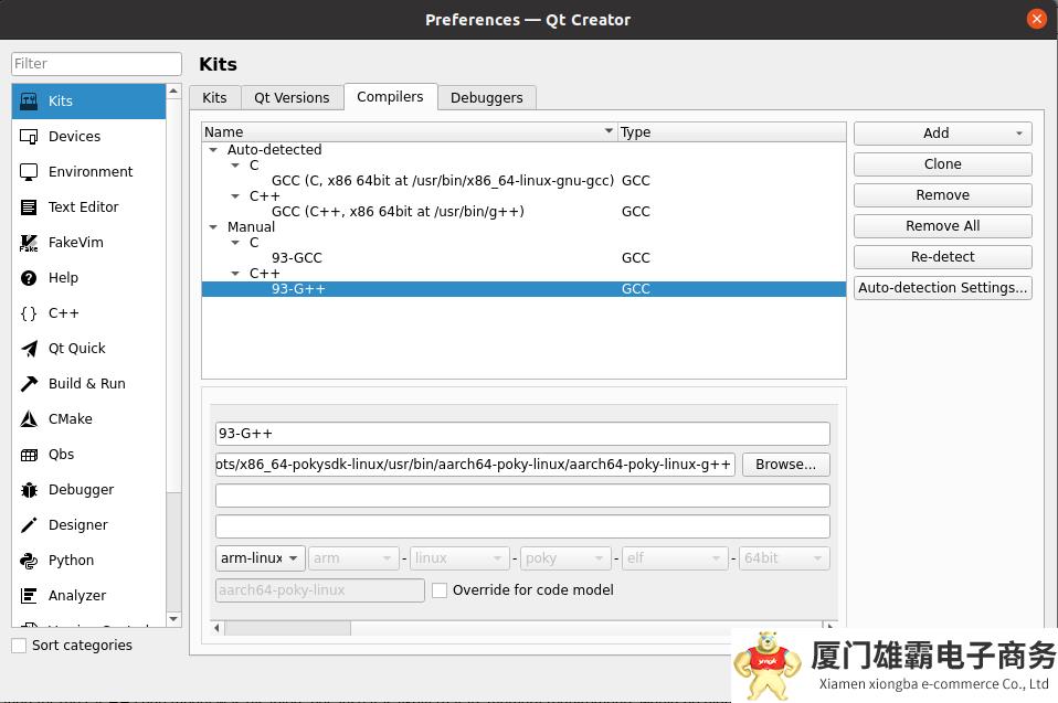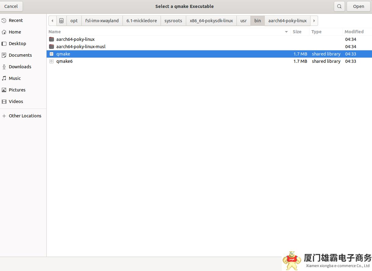 6)选择"Qt Version"标签,在右侧点击"Add",会弹出 qmake 路径选择对话框,这里以"/opt/fsl-imx-xwayland/6.1-mickledore/sysroots/x86_64-pokysdk-linux/usr/bin/qmake"为例子。选择"qmake"文件后,点击"Open"按钮。"Version name"改为"Qt %{Qt:Version} (LM93-sytem)"。然后点击"Apply"按钮。