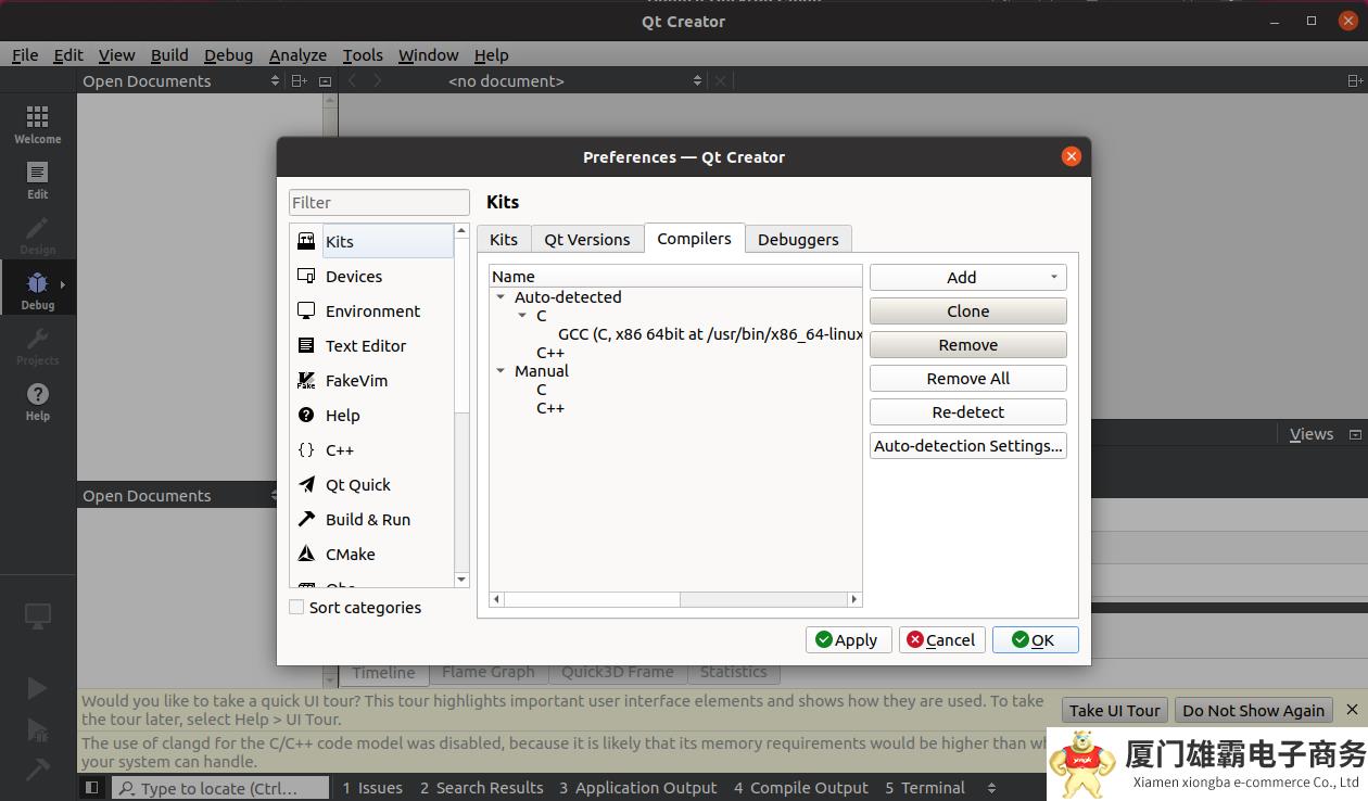 3 再次运行成功,出现选项对话框,点击Edit,继续点击Preferences,,在Kits栏选择Compilers标签,如下图所示。