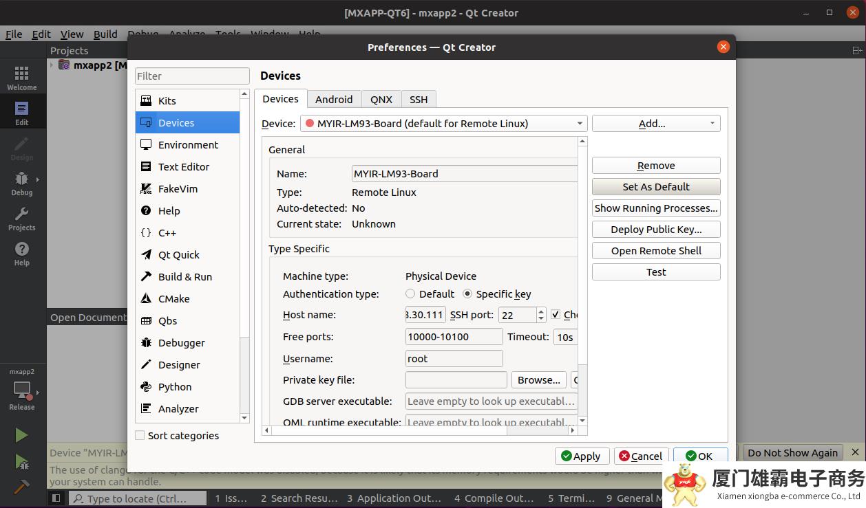 7) 选择左侧"Device",点击右边的"Add"按钮,填写内容"Name"为"MYIR-LM93-Board","Host name"为开发板的 IP 地址(可以暂时填写任意一个址),"Username"为"root",然后击"Apply"。(此项为可选项)